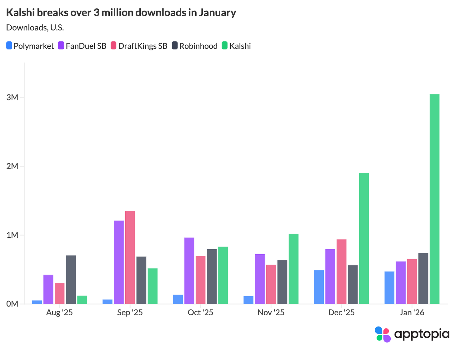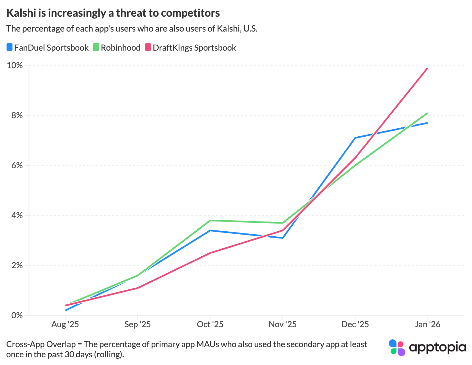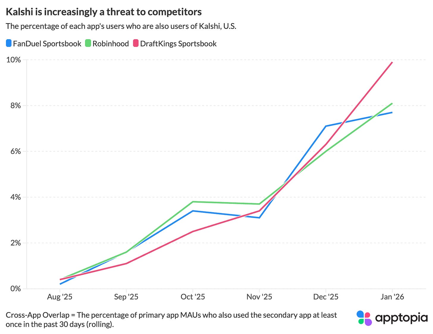 “Apptopia’s consumer device panel is able to measure cross-app overlap, or the percentage of one app’s users who are also using another app. About 10% of DraftKings Sportsbook app users were also using Kalshi in January. The cross-app overlap between Kalshi and the major sportsbooks has been growing almost every month since August.”