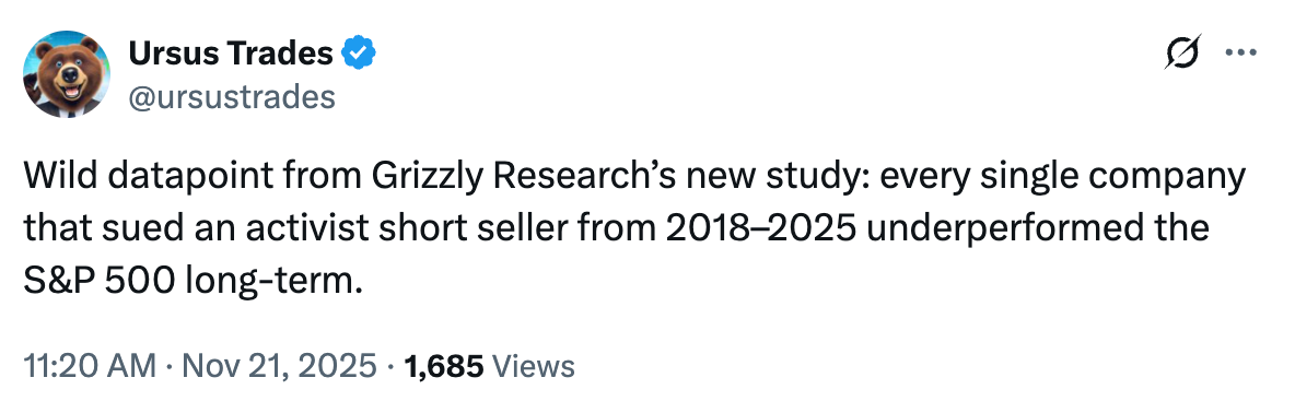 “A previous empirical study by Brendel and Ryans (2021) has shown that stocks of firms that choose litigation to respond to short seller reports exhibit a strong price underperformance in the long run. We present an updated study based on 1,100 short activist publications against 906 target firms from January 1, 2018, to August 1, 2025. 24 lawsuits were filed by target firms against the publisher; in all 24 cases, the firm’s share price failed to long-term recover against the S&P 500.”