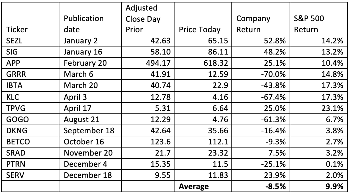 On average, these 2025 investigations declined 8.5% from publication, compared to a 9.9% increase in the S&P 500. The table excludes follow-up reports on prior investigations, group reports such as “Diamonds Aren’t Forever,” “Problems at 100 Long-Term Underperformers,” and “Problems at Two Paper Products Companies,” as well as our coverage on U.S.-listed Chinese microcap companies. A chronological list of all our past investigations is available on our homepage. To 2026!