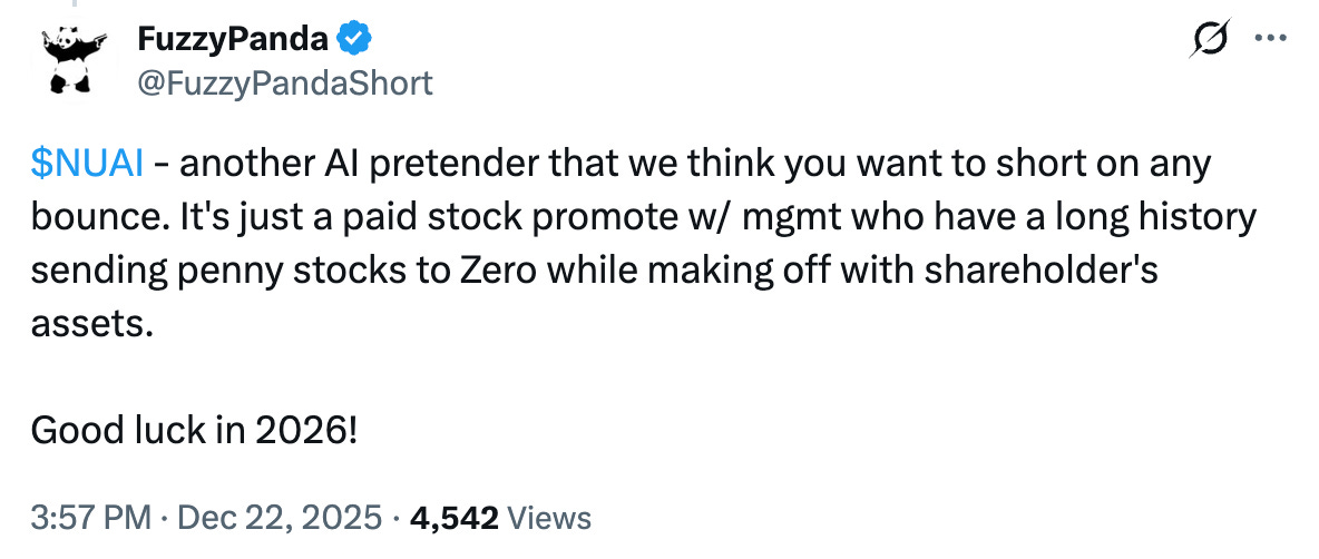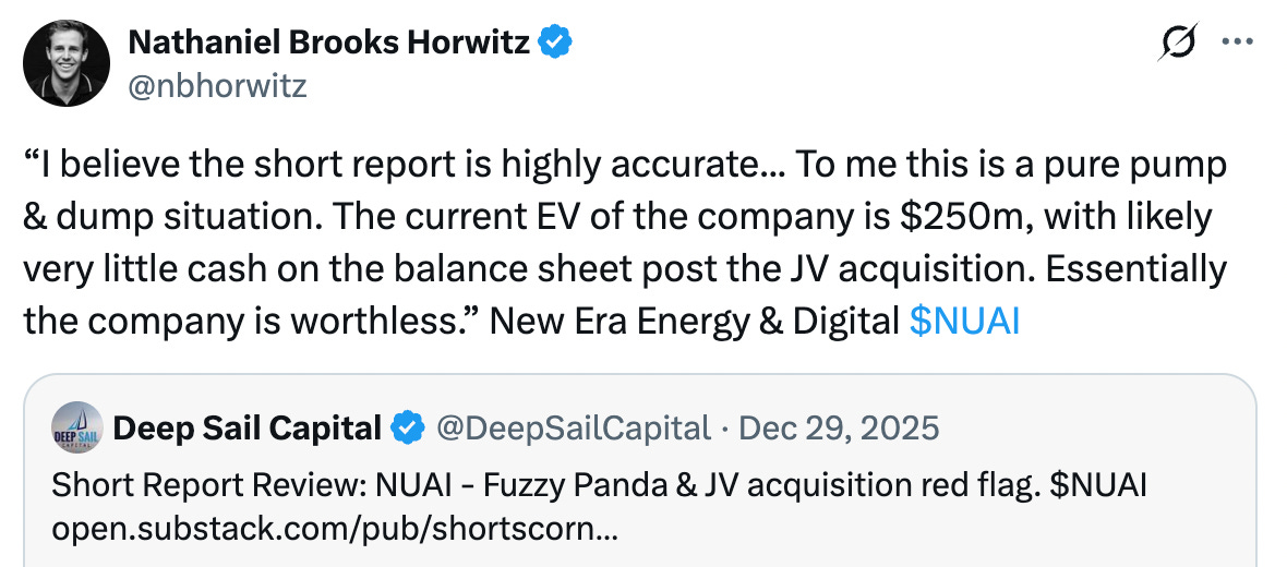 Hunterbrook Media published on New Era Energy & Digital (NASDAQ: NUAI — $184 million), a helium exploration company that pivoted to AI energy infrastructure. Hunterbrook highlighted a recent lawsuit from the New Mexico Attorney General “seeking to bar New Era from conducting business in New Mexico,” which would inhibit the company’s plans to develop data centers in the state.