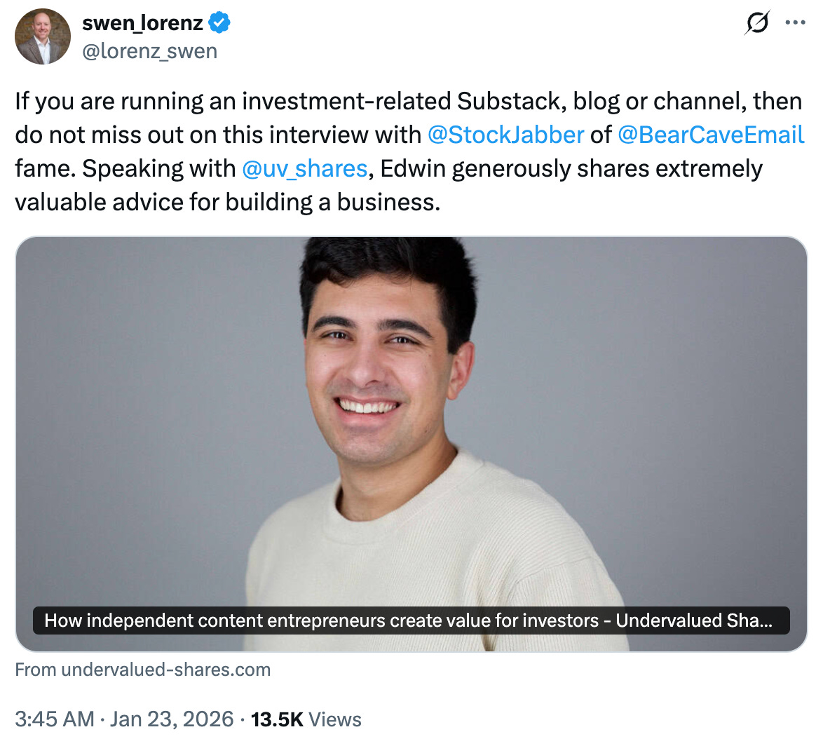 “If you are running an investment-related Substack, blog or channel, then do not miss out on this interview with Edwin Dorsey of The Bear Cave fame. Speaking with Undervalued Shares, Edwin generously shares extremely valuable advice for building a business…”